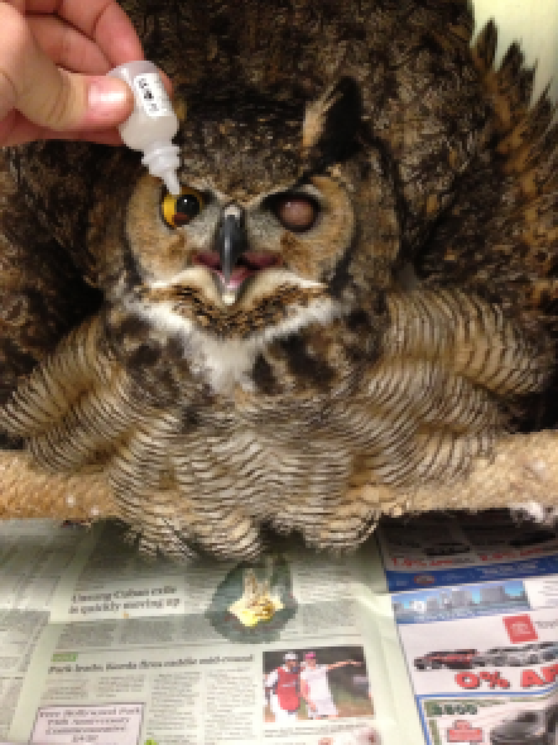 For treatment, PHS/SPCA staff administered ocular and oral antibacterial and anti-inflammatory pain medication for approximately one month. More so than the medication, however, the owl needed a considerable amount of time to reabsorb the blood in its eye. Over time, the owl regained normal sight in its right eye, but the left eye was determined to be permanently blind. PHS/SPCA chose not to surgically remove the blind eye; Great Horned Owls have large eyes proportional to their body and removing an eye would offset the owl’s balance in flight.