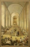 Before entering The Hall of Murals created by Italian painter, Gregorio Calvi di Bergolo (1904-1994) two oil paintings introduce a riveting illustrative story of medicine in its early days that will make you extremely grateful for the modern techniques of minimally invasive surgery, hygiene, sanitation and the separation of church and state. The painting will viscerally carry you back to the medieval times when hospitals were located inside of churches sharing the same space as those attending mass. One can only imagine that scenario was inconvenient and unsettling for both worshippers and patients. In addition, economics had an important influence on the lack of sanitation as beds were reused without cleaning the linens due to high laundry costs.