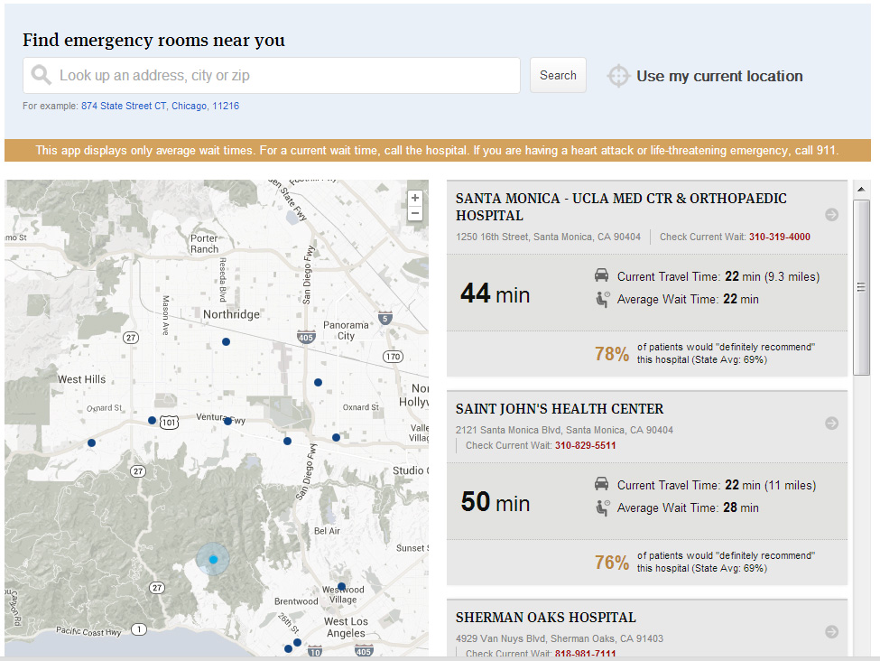 ProPublica’s new interactive “ER Wait Watchers” online app lets you know the average wait time of nearby ERs before you are seen by a medical professional. So the next time your child has an unexpected bout of stomach flu, you would know that, on average, you would be seen six minutes earlier at UCLA Medical Center than at Saint John’s Health Center.