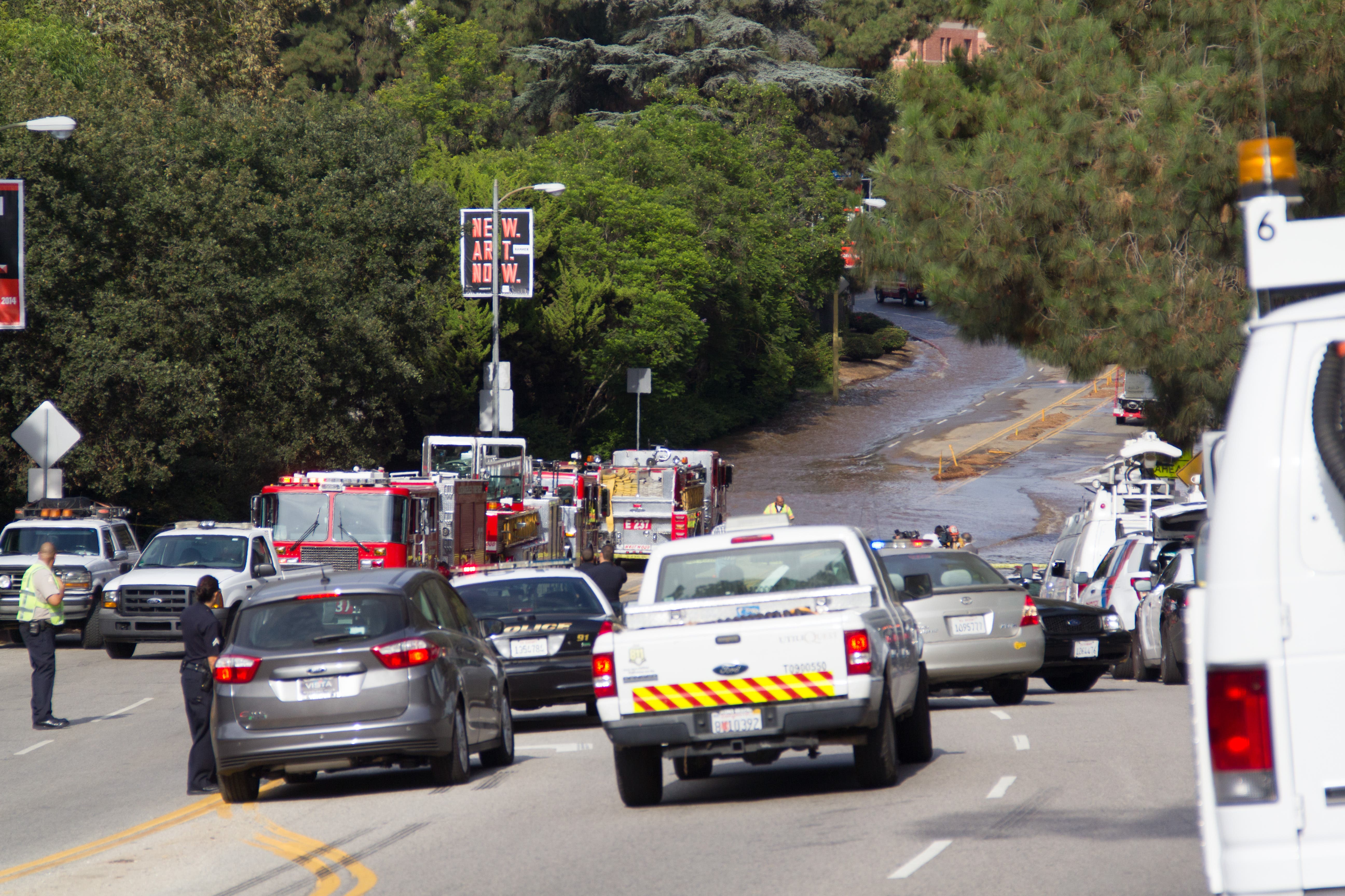 The 93-year-old water main, which carries water to the area from the Upper Stone Canyon Reservoir, ruptured on Sunset near Marymount Place just north of the campus shortly before 3:30 p.m. Tuesday, turning streets into rivers and portions of the UCLA campus into oceans of water and mud.