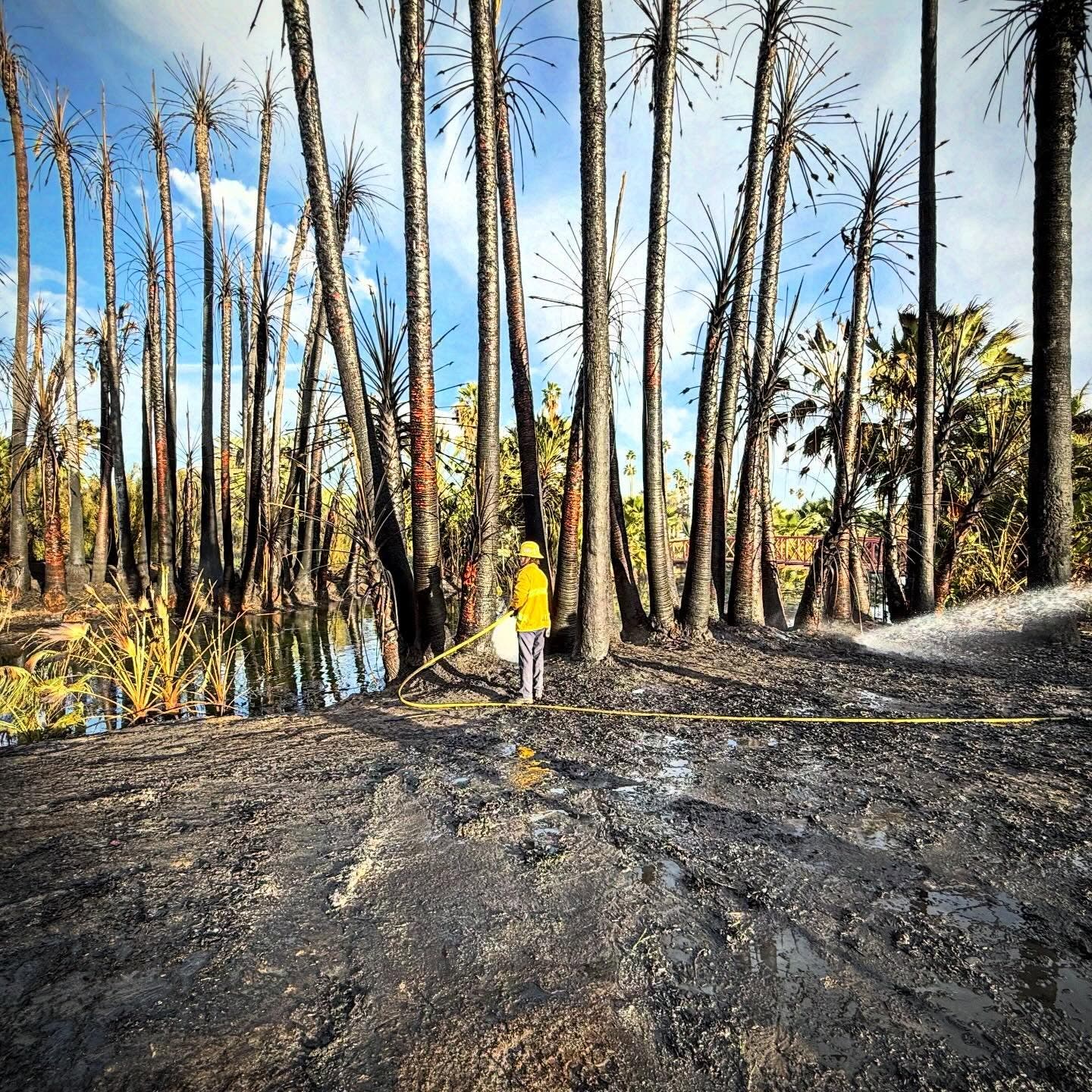 "The fire seems to have started around palm trees, off trail and right next to the water. It is important to be clear that this fire was not caused by dry conditions. The pond area is quite green and healthy," Garrison said.