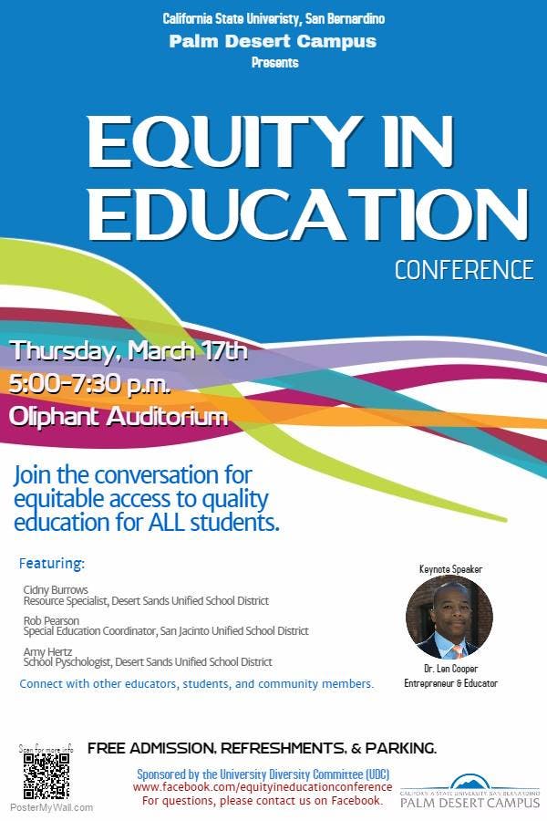 PALM DESERT, CA - Teachers, parents and students from three Coachella Valley school districts, as well as the San Jacinto Unified School District, will confer at the first “Equity in Education Conference” on Thursday, March 17, at Cal State San Bernardino’s Palm Desert Campus.