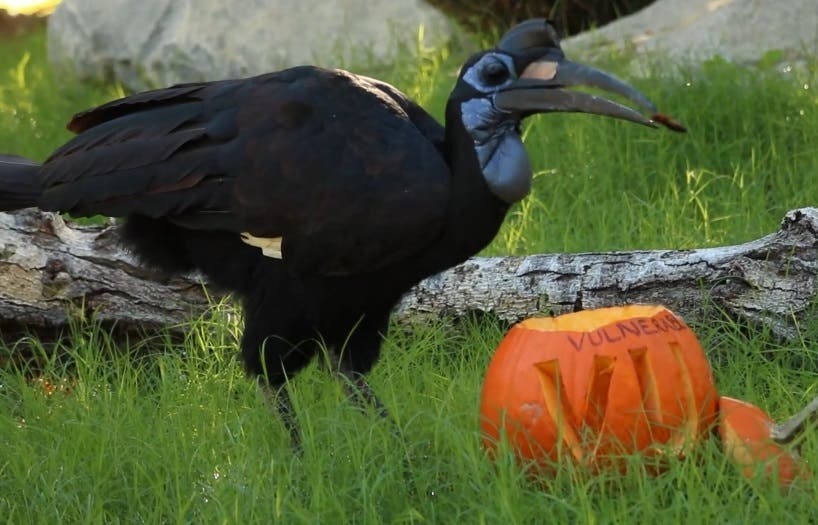 The Abyssinian Ground Hornbill pecked out the insides of its carved treat.