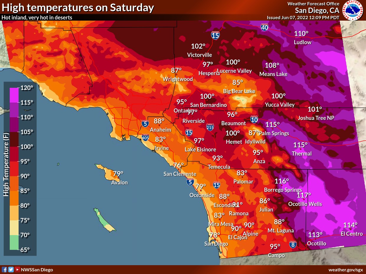In Riverside metro, high temps will settle in the mid-90s until Thursday, then cross the 100-degree mark Friday, through the weekend, and Monday, according to the NWS. Lows will be in the mid to upper 60s most of the week.