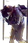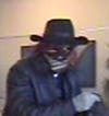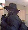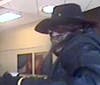 The suspect entered the bank wearing a black large-brimmed hat, a black leather jacket, a dark sweatshirt with two light-colored stripes across the chest, green cargo-type pants, sunglasses and a brown/tan bandana over his face, Nielsen said.