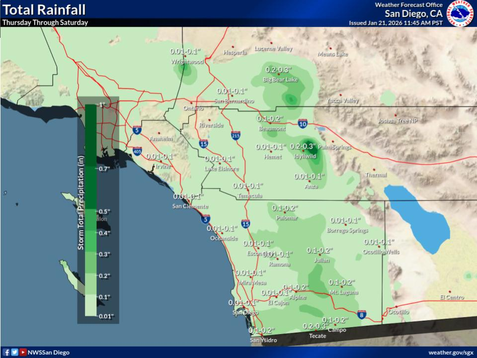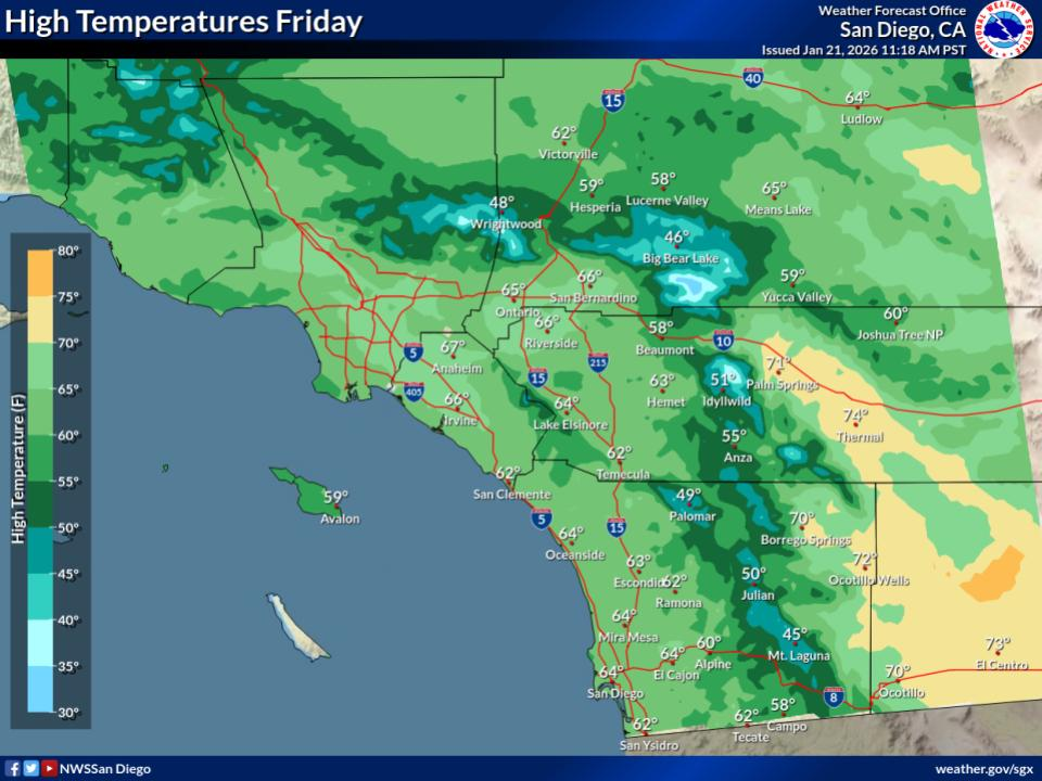 The Temecula Valley's daytime highs will hold in the low 60s, dropping into the upper 30s at night, the NWS said.