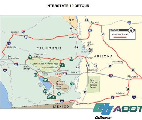 Motorists were advised to avoid I-10 travel and use detour routes such as Arizona Route 95 to Interstate 40 or Interstate 8 to State Route 111 to Route 86 to get around the closure. Another option is State Route 177 to State Route 62, then back onto Interstate 10.