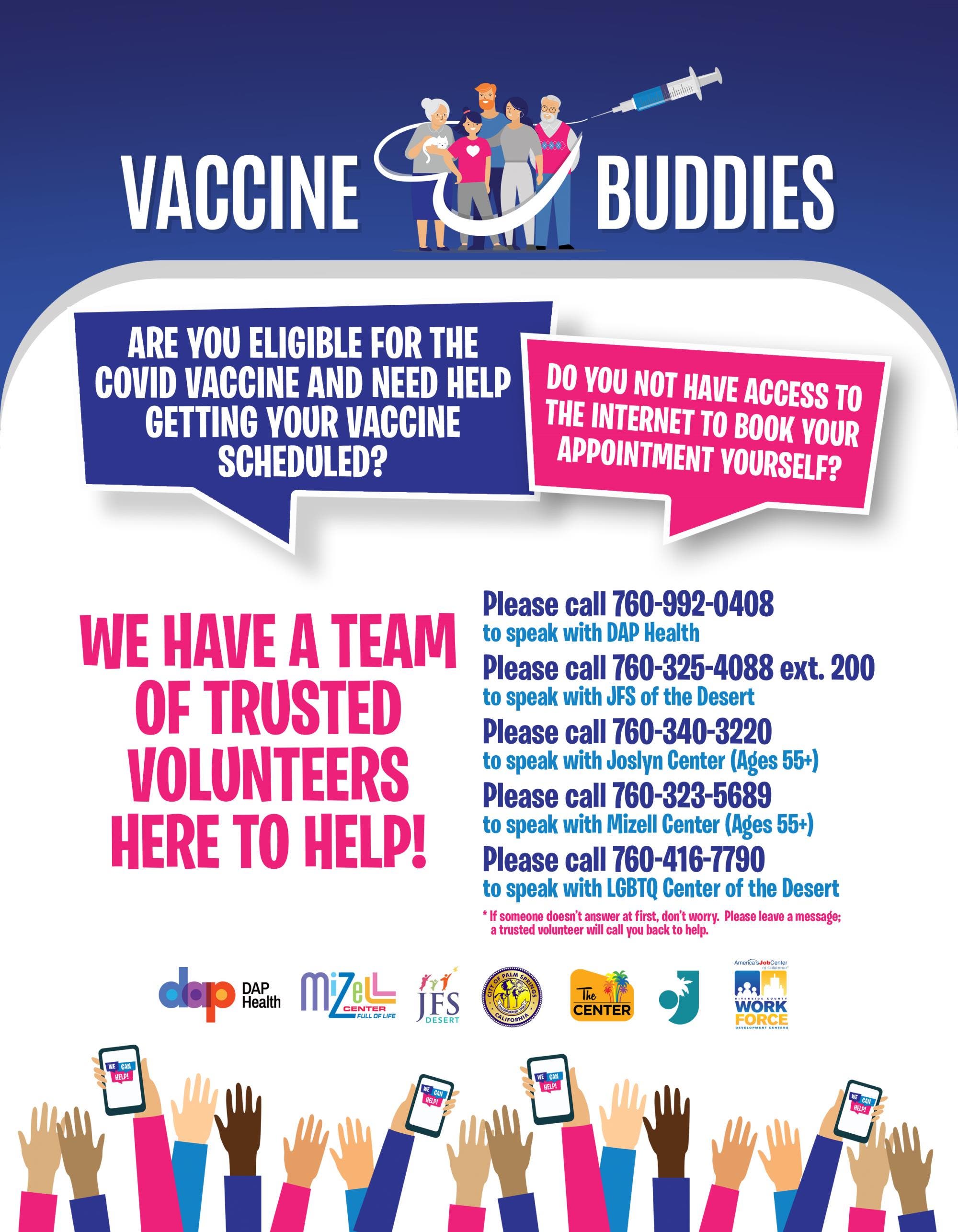 Banding together as Coachella Valley "Vaccine Buddies" are volunteers from DAP Health, Jewish Family Services of the Desert, The Joslyn Center, The LGBTQ Community Center of the Desert and The Mizell Center.