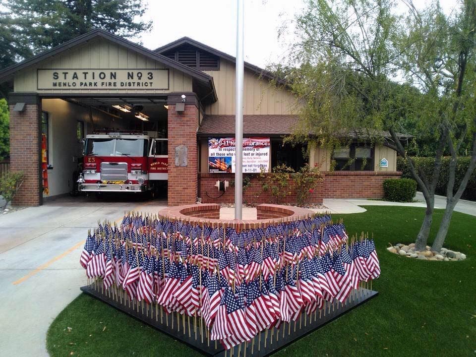 The district provides emergency services to East Palo Alto, Menlo Park, Atherton and portions of unincorporated San Mateo County. The memorial consisted of 343 small flags representing each firefighter who died while in the line of duty on Sept. 11. The flags were being held in a flag tray, which was built and paid for by the firefighters themselves, fire officials said.