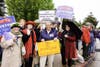 The Raging Grannies formed a circle to sing a protest song to the tune of "Home of the Range." Another was passing around a petition advocating for more transparency in campaign donations.