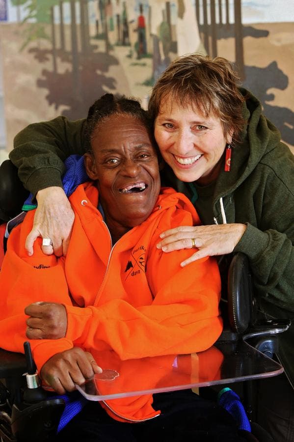 After that near decade-long absence from Camp Paivika, Leslie advocated to Kathy’s family that they pay for a hospital bed rental that made it possible for Kathy to return to camp in 2015 along with her sister Patty as her 1:1 support person. A 1:1 support provides 24/7 caregiving with support from AbilityFirst staff. That effort was so successful that this year, Leslie and Kathy were reunited at Camp Paivika with Leslie returning after 30 years as Kathy’s 1:1 support.