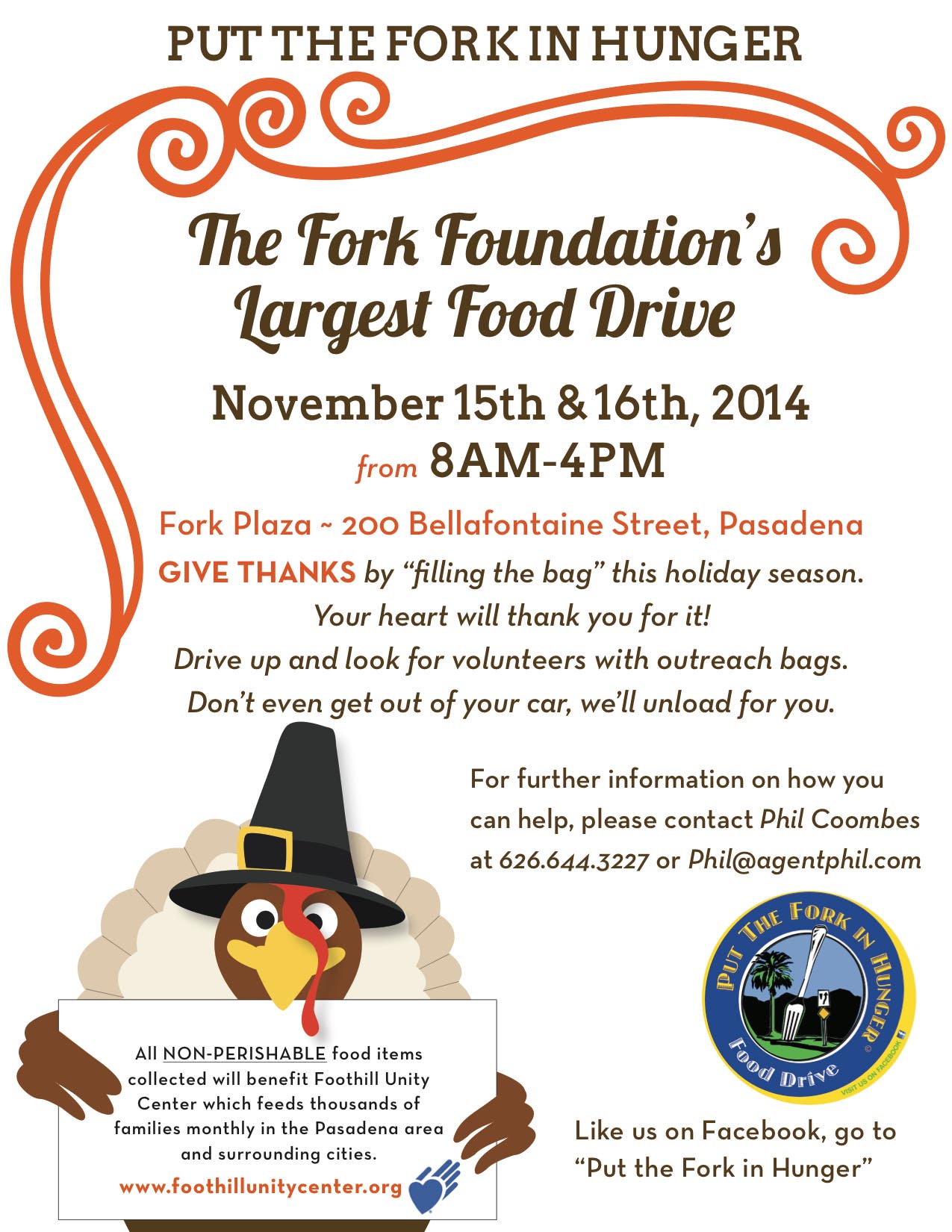 All NON PERISHABLE food items Benefitting Foothill Unity Center which feeds thousands of needy families monthly throughout Pasadena, Altadena and surrounding areas. If you would like to volunteer or have further questions please call 626.644.3227 or email at Phil@AgentPhil.com