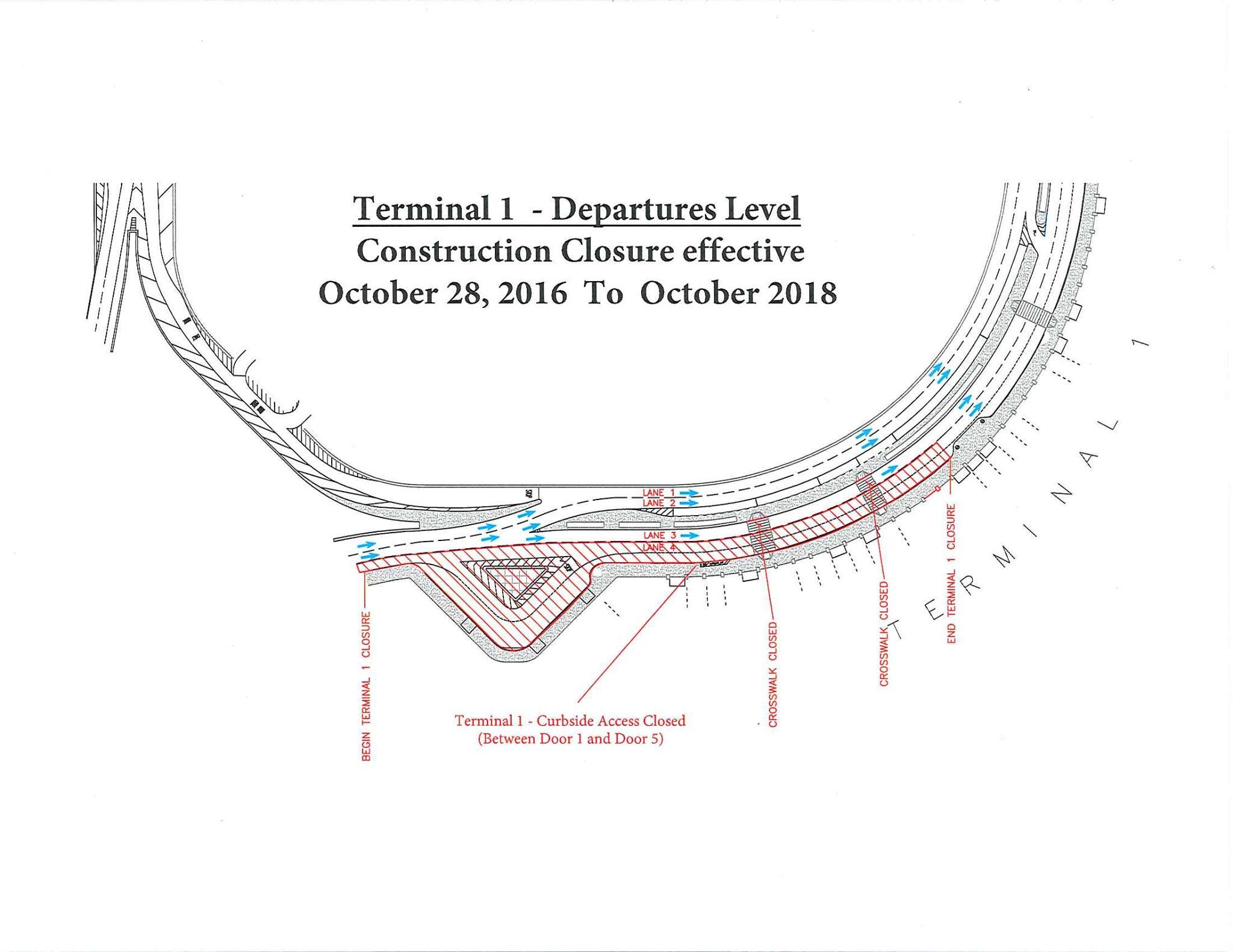Portion of roadways for arrivals and departures, plus connecting walkway to close around Terminal 1.