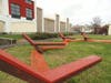 Principal Howard says the project will be completed, but is cordoned off because the uneven ground between the benches poses a trip hazard for the students and the bolts coming out of the benches are dangerous.