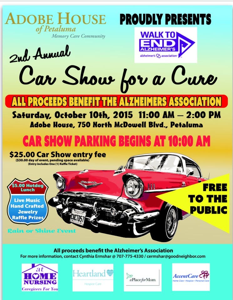 Adobe House, a Memory Care Community in Petaluma, is putting on a Classic Car show on Saturday October 10th, 2015. 100% of the proceeds of this car show will go to support the Alzheimer’s Association and its core mission of Alzheimer’s care, support and research.