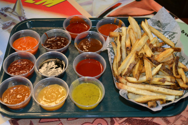 We dipped our large order of classic fries into dips such as Atomic, Mango Habonero, Cajun, Original Hot, Louisiana Rub, Mild, Hickory Smoked BBQ, Lemon Pepper, Garlic Parmesan, Hawaiian and Teriyaki. Flavors ranged from gentle to “wow”