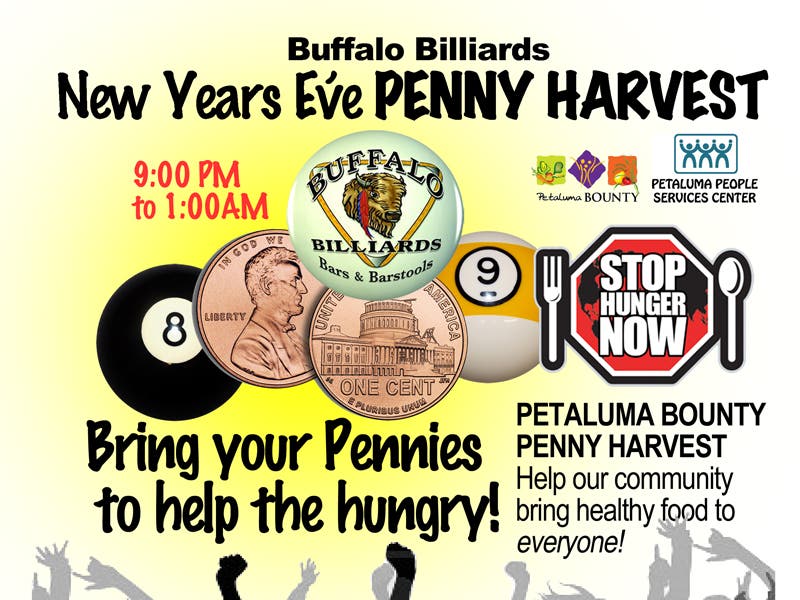 Here are some of the Buffalo Billiards crazy activities that will be taking place this New Year’s eve to help the Petaluma People’s Services Center and Petaluma Bounty harvest more pennies so they can buy more seeds to help stop hunger now.
