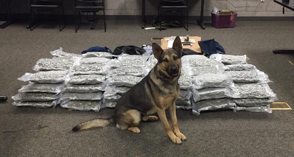 The deputy's drug-sniffing canine Jags alerted to several duffle bags of processed marijuana that were double-wrapped, shrink sealed and disguised with air freshener, Crum said. The value of the marijuana in New