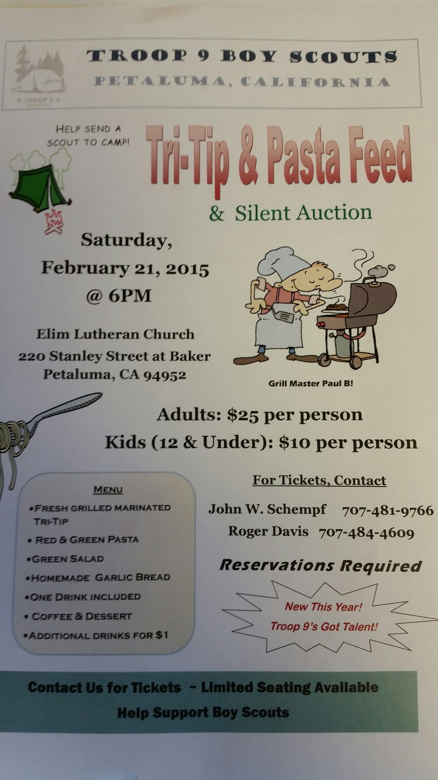 Please join us Feb 21st at 6pm at Elim Lutheran Church for Troop 9’s annual Tri Tip, Pasta Feed and Silent Auction.