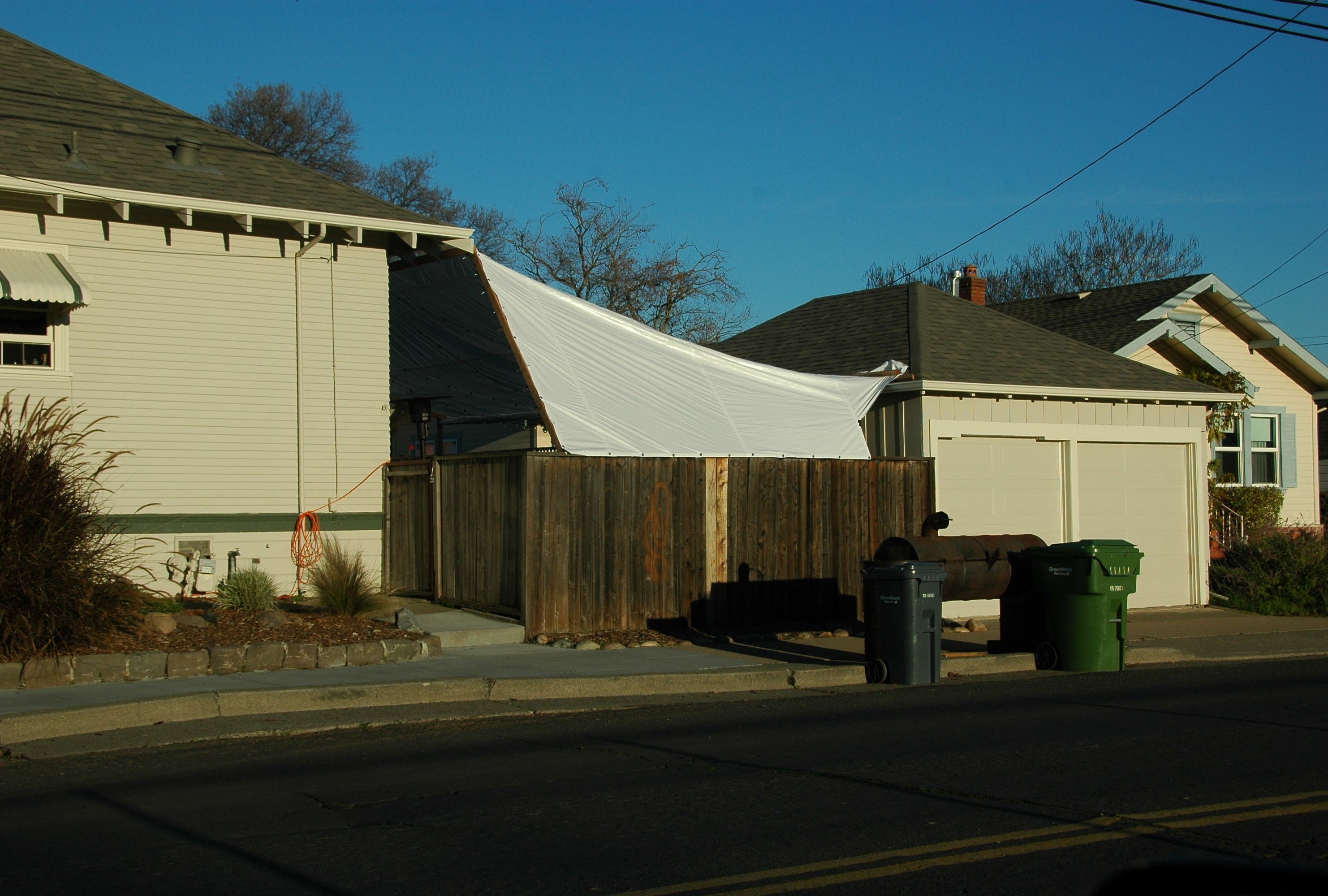 Perhaps some neighbors will be displeased, but I think it’s a great way to maintain a rich and full social life without needing an outsized house. And I’m pleased that the homeowners got the break they needed from the weather. I’m not sure I’d trust that tarp in a stormy gale.
