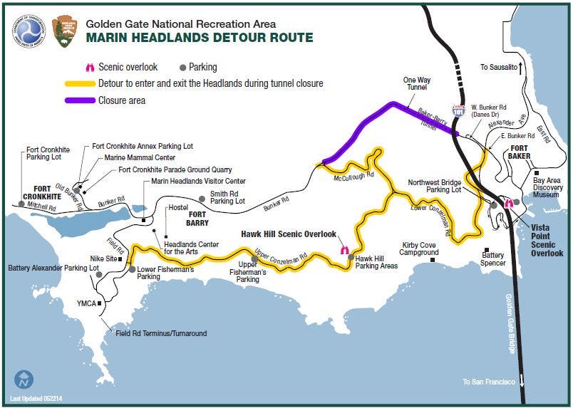 The January-May closure may cause limited access to Golden Gate Bridge overlooks. The Golden Gate National Recreation Area advises visitors to avoid traveling to the Marin Headlands during weekday rush hours between 3 p.m. to 7 p.m. and Saturdays and Sundays after 2 p.m.