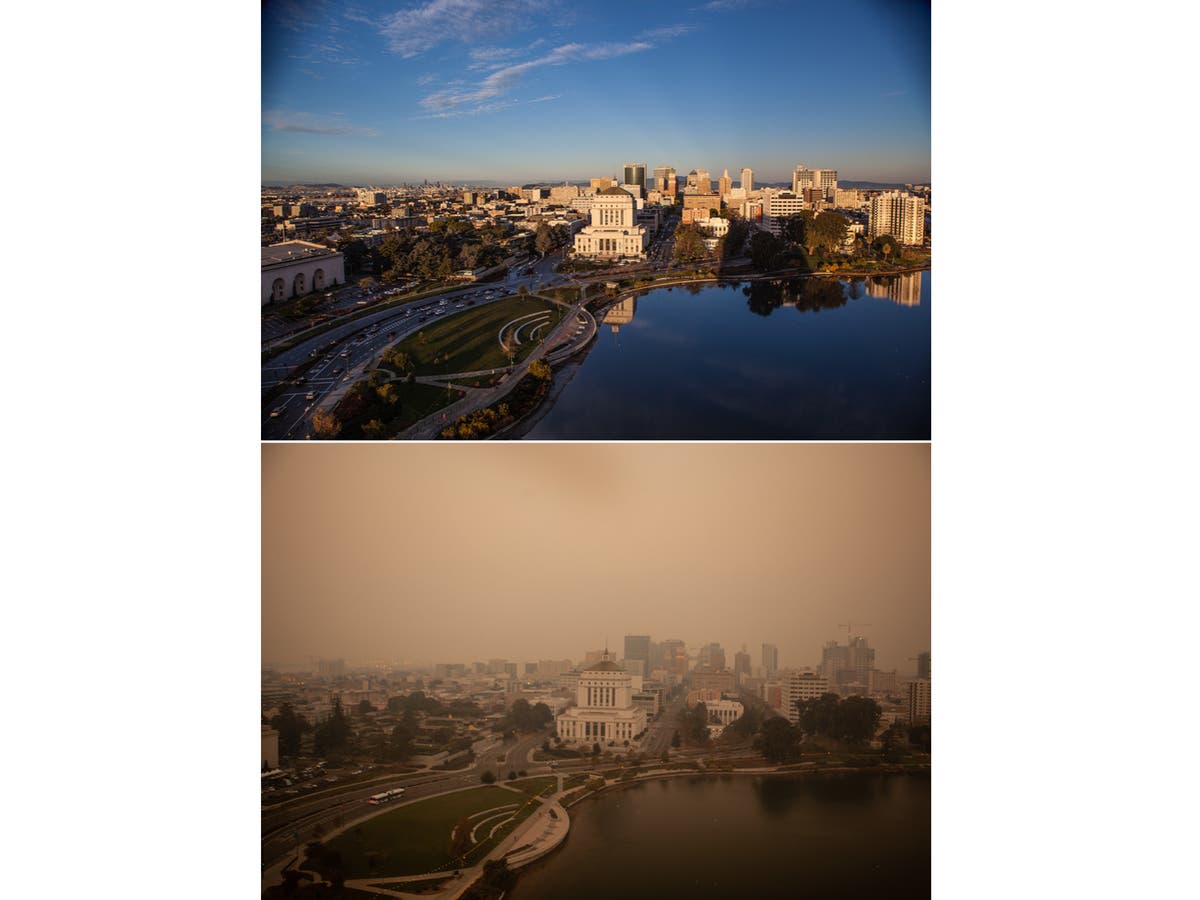 Susan Davis sent Patch a pair of photos taken from the same balcony in Oakland. One shows the view on a typical day, while the other was snapped since smoke from the Camp Fire in Butte County blanketed the area. The difference is remarkable, with the smoke photo looking like a sepia-toned print from the 1800s.