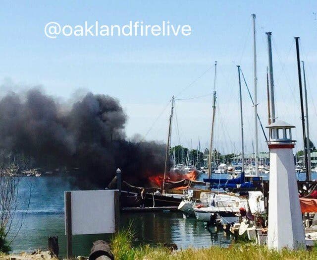 View of boat fire today (5th ave x Embarcadero) from OFD Marine1. @ktvu @ABC7 @nbcbayarea @EastBayTimes pic.twitter.com/sTe23ujKFK