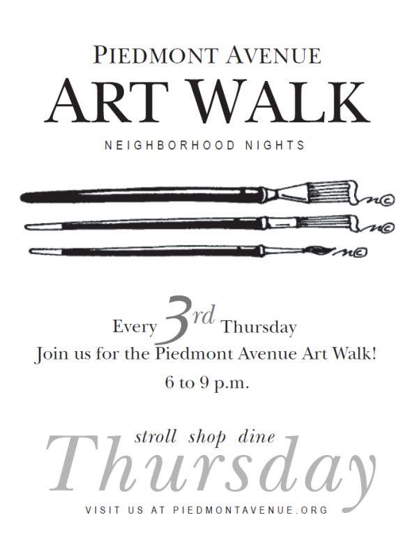 Art walk happens along Piedmont Ave every third Thursday from 6-9pm, once a month. Many merchants stay open late during this time featuring local art.