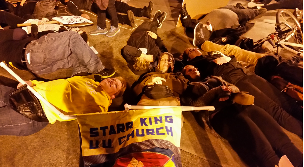 An estimated 400 to 500 people had gathered at the intersection around 6 p.m., city officials said. They had yelled, “Hands up don’t shoot” and “Black lives matter.” Many protesters held a “die-in” in which they laid down on the street with their bodies traced with chalk on the roadway. After the decision was announced, a large crowd continued to march up Broadway, walked through Chinatown and headed east on Seventh Street. Small groups of people stayed at the plaza calling for peace in light of the grand jury’s decision. Protesters attempted to enter Interstate Highway 880 from Seventh and Jackson Streets only to be blocked by police and made their way back to 14th Street and Broadway.