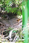 It's springtime and our garden is bursting with new life. Butterflies laying eggs, plants and flowers blooming, and today's most exciting: a towhee mama bird sitting on her eggs in a nest! But wait, you have to hear the whole story. George was gardening when the bird flew out of a small fir tree that we have by the pond - we keep it in a pot and use it as our Christmas tree. He kiddingly said to her, "What, you have a nest in there?" After peeking in he saw that indeed she did! She's so well hidden - try to find her in the photo.