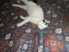 twinkle is a very friendly one year old kitten. he is white except a black tail and a black heartshaped mark on his back near the tail and black right ear. has yellow eyes