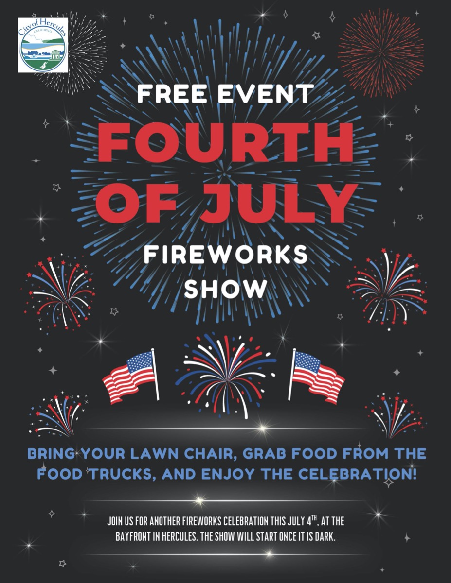 Pinole-Hercules|Local Event4th of July Fireworks 2025: HerculesMichael Wittner, Patch StaffJul4Event DetailsFri, Jul 4, 2025 at 8:00 AMAdd to calendarBayfront Boulevard, Bayfront Blvd, Hercules, CA, 945474th of July Hercules Fireworks 8 p.m.Bayfront Boulevard From City of Hercules: Share