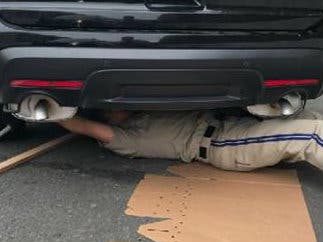 The kitty was exactly where callers described, huddled against a sound wall. Officer Hsiao pulled over to help the tiny creature. But as the officer approached the kitten, it bolted — launching itself up into the rear suspension of the patrol vehicle.