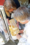 It also leaves the honeycomb intact, so we put it back into the hives for the bees to use again. In the photo George and our friend Joan are “scoring” the capped honey so it will spin out of the comb easily when we put it into the extractor.