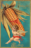 Without further ado, I bring you ... Thanksgiving greetings! In the first card, a beribboned ear of corn is held aloft by a sweet winged cherub. All that's written on the back is "From Arlene." It's postmarked 1909.