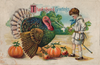 The next: No cherub this young boy. He's got a nasty little sword, and it looks like he'll really need it to take down the proud turkey, who's staring him right in the eye. It's postmarked 1913, and includes a chatty message to the sender's sister, including a little sisterly poke that the reason their mother hadn't answered her card was that she didn't put her address on it.