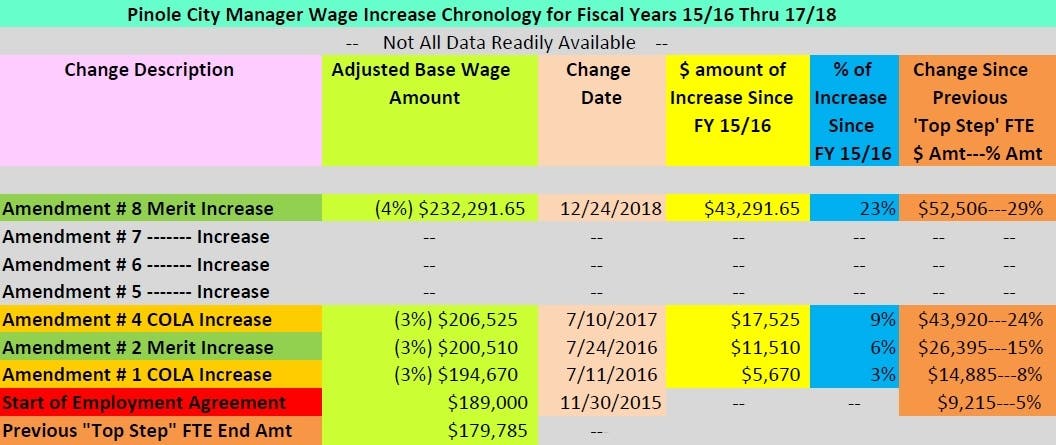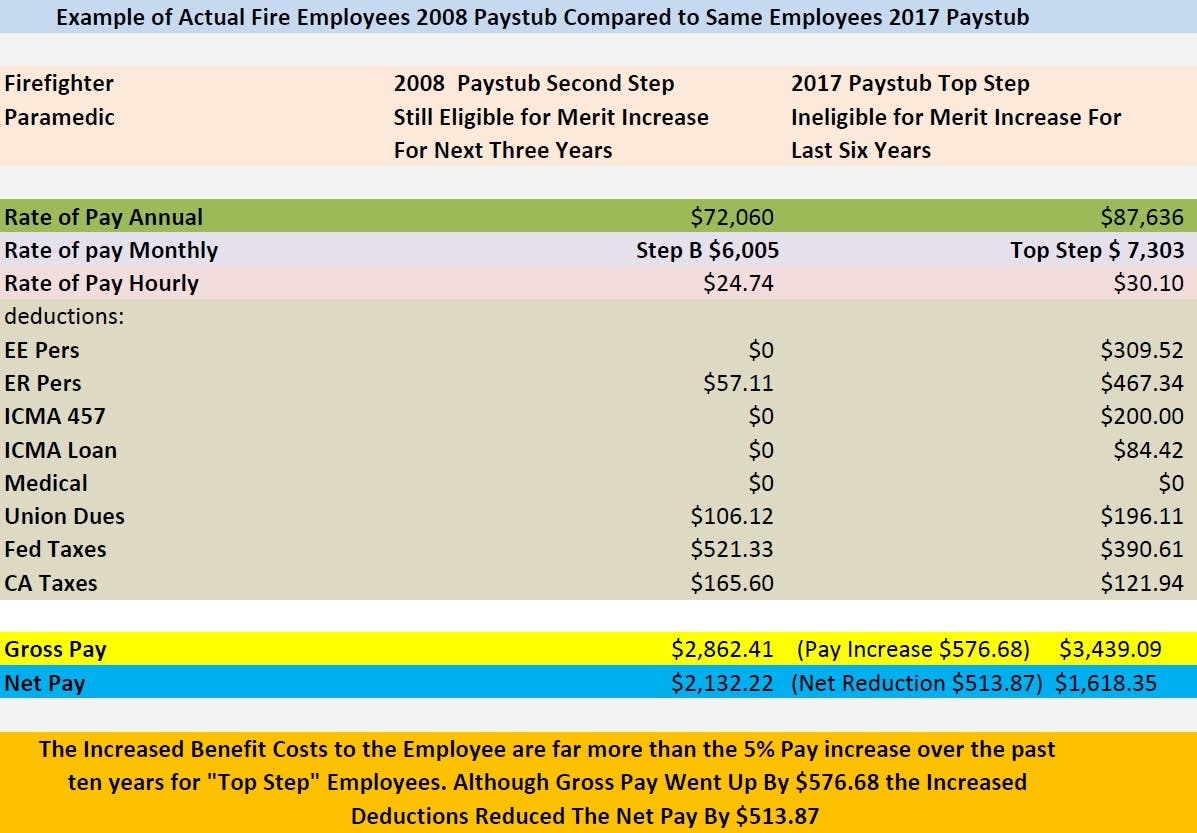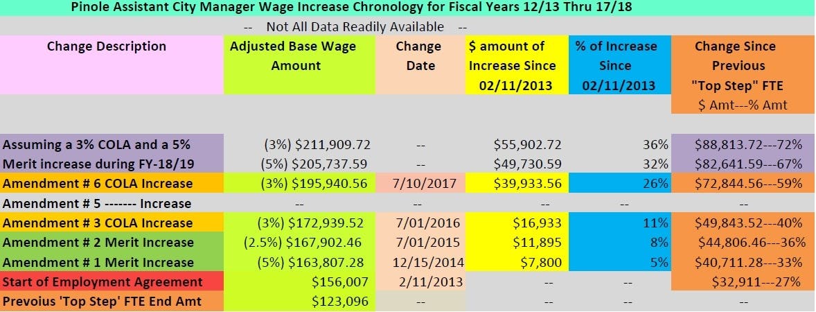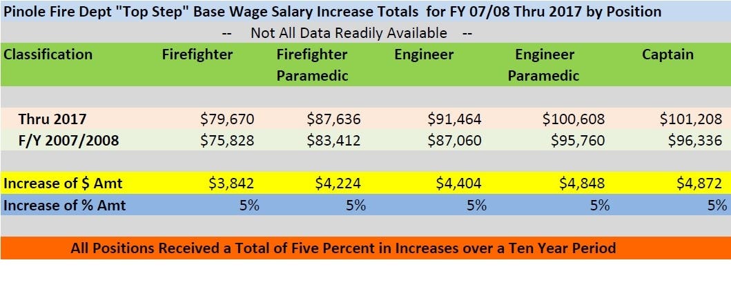 Council member Toms is correct that most City employees have contracts which allow for specific increases over time, five steps(merit increases), one per year seems to be the standard for Pinole. Annual COLA and competitive Salary Survey Adjustments were additional increases as well until those were suspended for employees due to the economic meltdown. Although dependent on them to keep up with the cost of living, most current City employees have not gotten those additional increases back yet. Most current City employees are "top step" employees with five or more years so they no longer receive merit increases, and some haven't for years, which leaves them with only the minute increases negotiated during contract negotiations with the City through the City Manager and Assistant City Manager. These top step employees also pay larger amounts towards pension and healthcare costs since losing the Merit, COLA and Salary Survey Adjustments despite the small wage increases which don't even cover the increased pension and healthcare costs. The extra costs to some employees have constituted a net pay cut as compared to net pay way back in 2008.