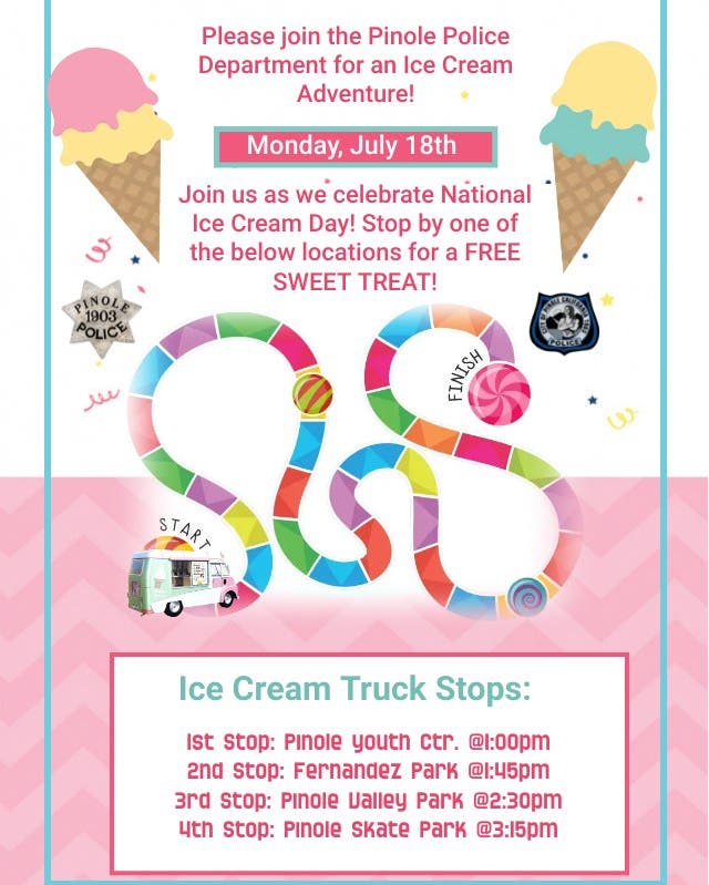 And we're in luck this month as the Pinole Police Deaprtment is planning an "Ice Cream Adventure" with four stops and freebies to mark National Ice Cream Day.