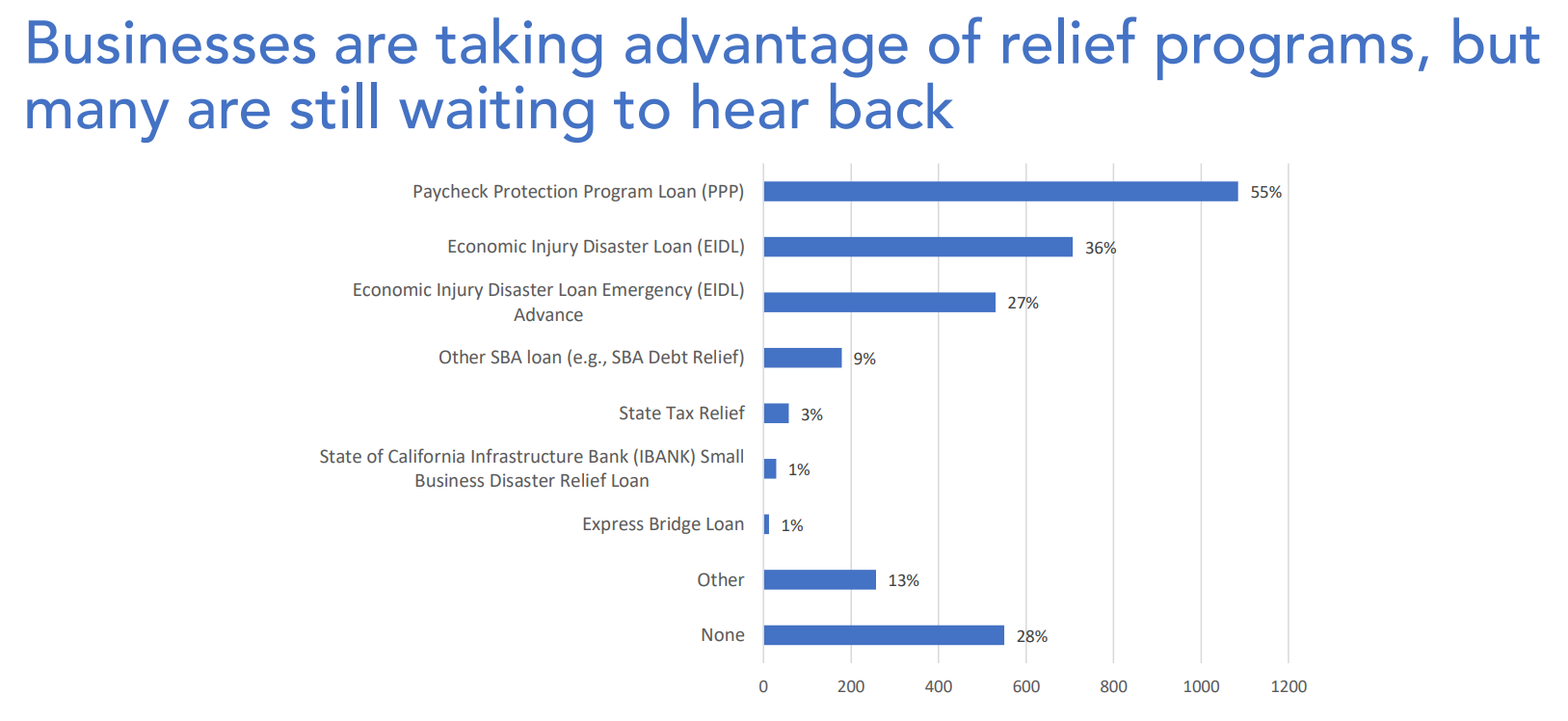In Contra Costa California, we are finding that 80% of businesses are microbusinesses employing under 10 employees. We know that these businesses also have a limited cash reserve and are not in a position to take on more debt, especially with landlords collecting rent. Many of these microbusinesses are sole proprietorships and are minority-owned which rely on the general public to keep them afloat. One of the bigger issues at this time is that the employees of the small businesses are hesitant to return to work for safety concerns (which then ties in health insurance stuff) and at the same time they do not want to return because of the unemployment checks that may be greater than their salary.