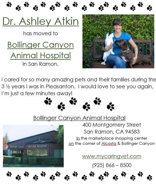 Veterinarian, Ashley Atkin DVM, has moved to Bollinger Canyon Animal Hospital in San Ramon.