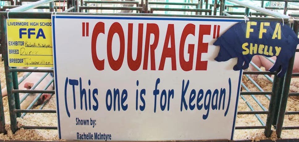 Kelly Prentice-Allen, a longtime family friend of the Cowell-Lyons family, said her son, Ty Cooper Allen, 12, a member of the Livermore 4H group, bred and donated Courage to help the Cowell-Lyons family. Livermore High School senior Rachelle McIntyre, 18, raised the pig on their property after Prentice-Allen's son, who goes by Cooper, sold him to her for a dollar. Prentice-Allen says Cooper came up with the idea to use the pig to raise funds for the young family.