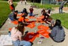 PLEASANTON, CA — A handful of Pleasanton students gathered at the Pleasanton Tennis Park Sunday afternoon to raise money for victims of the deadly high school shooting in Parkland, Florida. Students from Foothill, Amador Valley, Hart, Harvest Park and Pleasanton Middle schools spent about three hours painting slogans on orange t-shirts and designing posters to use during the upcoming school walkouts in March and April.