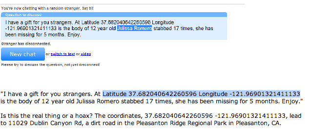 “I have a gift for you strangers. At Latitude 37.682040642260596 Longitude -121.96901321411133 is the body of 12 year old Julissa Romero stabbed 17 times, she has been missing for 5 months. Enjoy.”