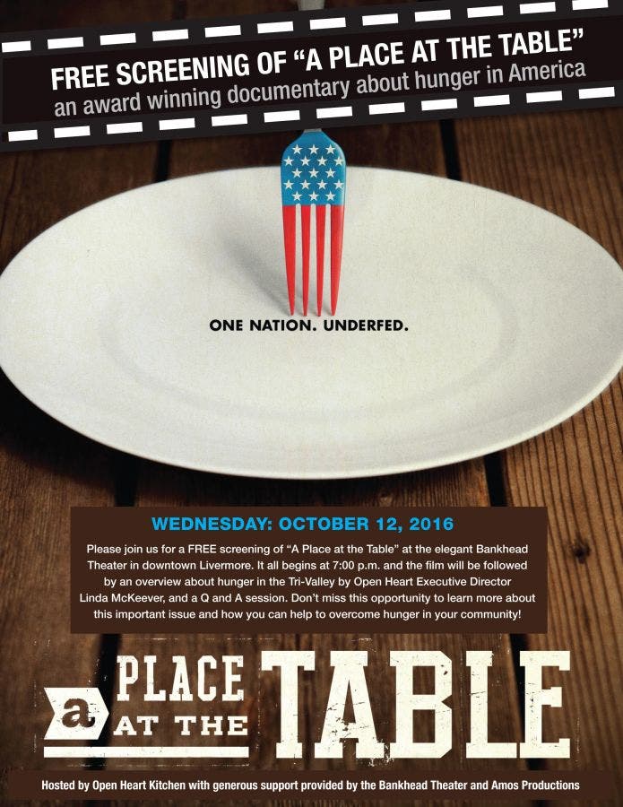 Pleasanton, CA - Open Heart Kitchen (OHK), the only hot meal program in the Tri-Valley area, will host a free screening of the award winning documentary “A Place At The Table: One Nation Underfed” on Wednesday, October 12, 2016 at 7:00 p.m. at the elegant Bankhead Theater in downtown Livermore. The event is made possible through the generous support of the Bankhead Theater and Amos Productions.