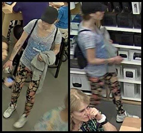 "Do you know this person? She took two iPod Shuffles from Pleasanton's Apple store on April 18.