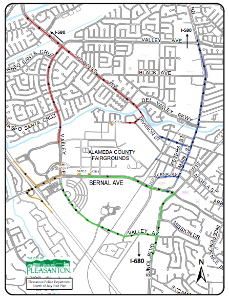 “This traffic plan was designed to create a more orderly exit from the fairgrounds on July 4th, one that will expedite the flow of traffic and allow emergency vehicles access to the fair if necessary,” according to Pleasanton Police Chief Dave Spiller. “Our best advice to those who plan to attend the festivities at the fair on July 4 would be to arrive early to secure parking. Those who are not planning to attend the fair would do best to avoid the area to avoid congestion.”