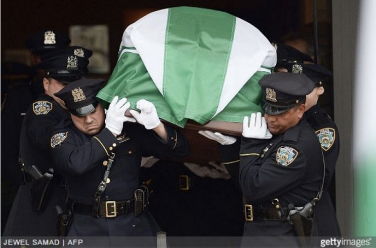 PHOTO: New York Police Department (NYPD) officers carry the casket of their fellow officer Wenjian Liu to start a procession in New York’s borough of Brooklyn on January 4, 2015. A sea of blue uniformed officers crowded around a Brooklyn funeral home to honor Wenjian Liu, 32, shot in the head with partner Rafael Ramos, 40, on December 20, 2014 as the pair sat in their patrol car. The brutal double-slaying at the hands of a black gunman claiming to be avenging the deaths of African-Americans during confrontations with police shocked the nation’s largest city. CREDIT: JEWEL SAMAD/AFP/Getty Images