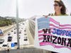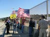 The rally participants in Pleasanton held signs and American flags at the overpass overlooking Interstate 580, near the Stoneridge mall and Dublin Boulevard.