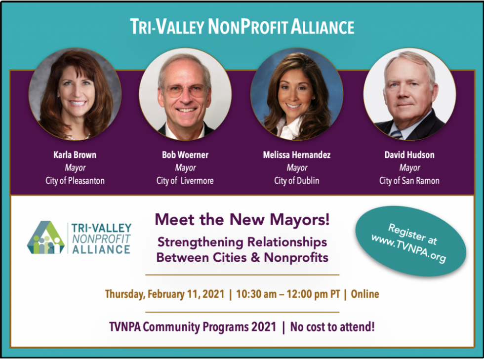 Join us online to meet four of the Tri-Valley’s new mayors! Focusing on strengthening the relationship between cities and local nonprofits, TVNPA will hold a conversation with mayors from the cities of Dublin, Livermore, Pleasanton, and San Ramon. Learn what is of importance to them and how we as nonprofits can best work together with our city governments as we move forward in 2021. Don’t miss this opportunity to introduce these new mayors to our wonderful nonprofit community!