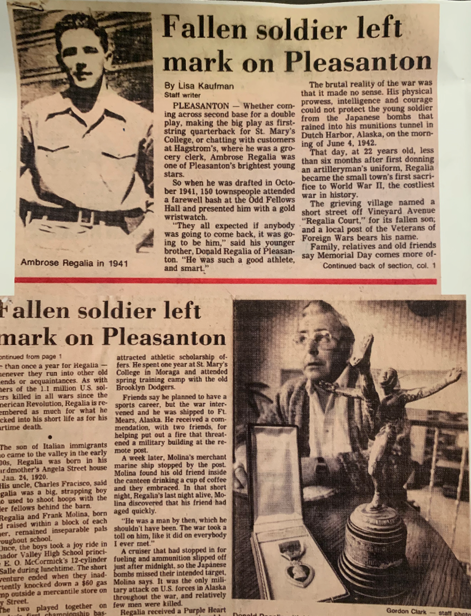 Before he was killed in a Japanese Navy attack at Alaska’s Dutch Harbor in 1942 at just 22 years old, he was a celebrated basketball and baseball star who was even drafted to play for the Brooklyn Dodgers. When he left for the army, about 150 Pleasanton residents gathered to send him off. He was posthumously awarded a Purple Heart, which Regalia’s uncle still keeps.